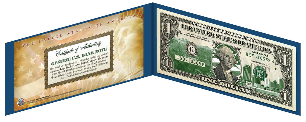 This ARIZONA State uncirculated One-Dollar Bill is Genuine Legal Tender of the United States, which has been enhanced with beautiful iconic images of the State. The green-and-white colorized images are accomplished through a revolutionary new authentic & genuine colorization process pioneered by The Merrick Mint, creating a collectible work of art. Included is a blue display portfolio plus a Certificate of Authenticity to guaranty that your bill is authentic and recognized by every monetary authority around the world, and assuring its Collector Edition status. Only genuine Legal Tender $1 United States Bills are used for this unique colorization process. Each $1 Bill is in FRESH, CRISP, UNCIRCULATED condition, and was directly removed from untouched wrapped Federal Reserve sealed packs. The first U.S. President, George Washington , is featured on the obverse, along with the special colorization overlay. The Great Seal of the United States is featured on the reverse.