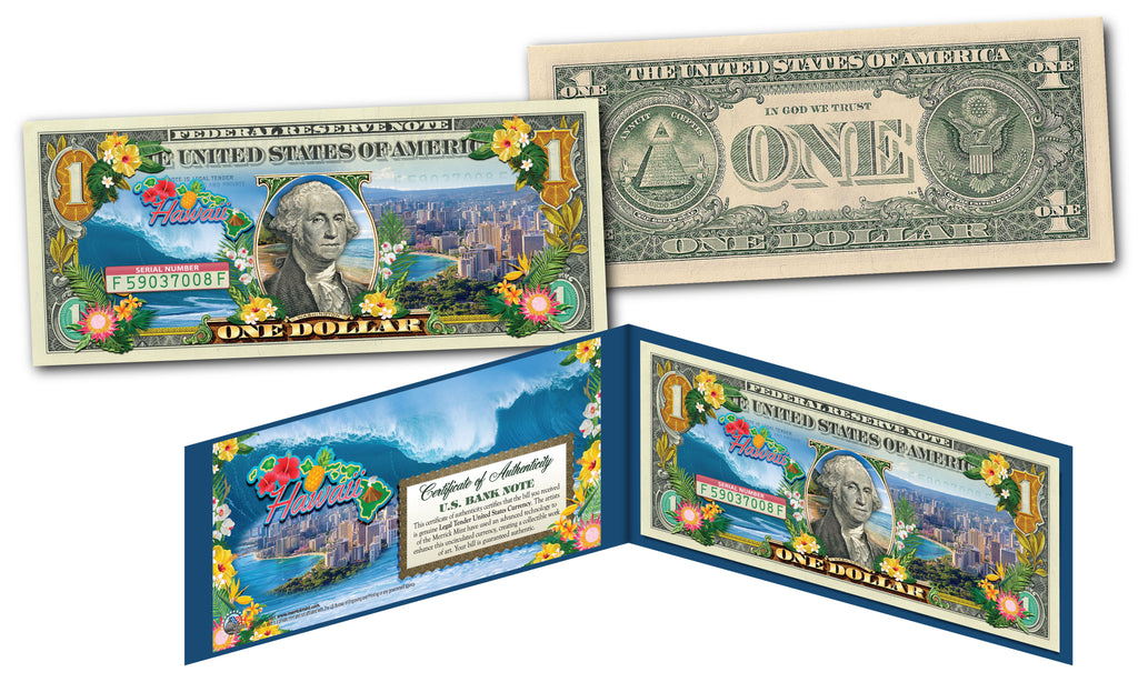 This HAWAII State uncirculated One-Dollar Bill is Genuine Legal Tender of the United States, which has been enhanced with beautiful iconic images of the State. Hawaii's diverse natural scenery, warm tropical climate, abundance of public beaches, oceanic surroundings, and active volcanoes make it a popular destination for tourists, surfers, biologists, and volcanologists. These colorized images are accomplished through a revolutionary new authentic & genuine colorization process pioneered by The Merrick Mint, creating a collectible work of art. Included is a blue display portfolio plus a Certificate of Authenticity to guaranty that your bill is authentic and recognized by every monetary authority around the world, and assuring its Collector Edition status. Only genuine Legal Tender $1 United States Bills are used for this unique colorization process. Each $1 Bill is in FRESH, CRISP, UNCIRCULATED condition, and was directly removed from untouched wrapped Federal Reserve sealed packs. The first U.S. President, George Washington , is featured on the obverse, along with the special colorization overlay. The Great Seal of the United States is featured on the reverse.
