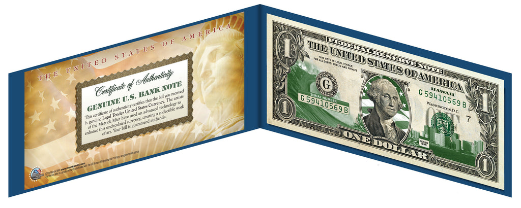 This HAWAII State uncirculated One-Dollar Bill is Genuine Legal Tender of the United States, which has been enhanced with beautiful iconic images of the State. The green-and-white colorized images are accomplished through a revolutionary new authentic & genuine colorization process pioneered by The Merrick Mint, creating a collectible work of art. Included is a blue display portfolio plus a Certificate of Authenticity to guaranty that your bill is authentic and recognized by every monetary authority around the world, and assuring its Collector Edition status. Only genuine Legal Tender $1 United States Bills are used for this unique colorization process. Each $1 Bill is in FRESH, CRISP, UNCIRCULATED condition, and was directly removed from untouched wrapped Federal Reserve sealed packs. The first U.S. President, George Washington , is featured on the obverse, along with the special colorization overlay. The Great Seal of the United States is featured on the reverse.