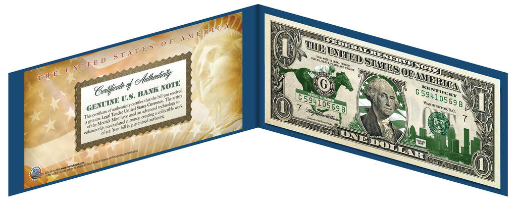 This KENTUCKY State uncirculated One-Dollar Bill is Genuine Legal Tender of the United States, which has been enhanced with beautiful iconic images of the State. The green-and-white colorized images are accomplished through a revolutionary new authentic & genuine colorization process pioneered by The Merrick Mint, creating a collectible work of art. Included is a blue display portfolio plus a Certificate of Authenticity to guaranty that your bill is authentic and recognized by every monetary authority around the world, and assuring its Collector Edition status. Only genuine Legal Tender $1 United States Bills are used for this unique colorization process. Each $1 Bill is in FRESH, CRISP, UNCIRCULATED condition, and was directly removed from untouched wrapped Federal Reserve sealed packs. The first U.S. President, George Washington , is featured on the obverse, along with the special colorization overlay. The Great Seal of the United States is featured on the reverse.