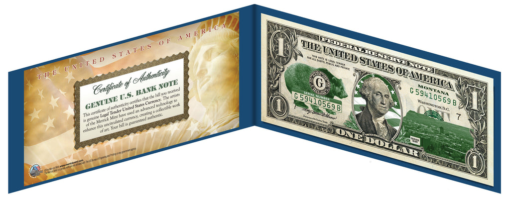 This MONTANA State uncirculated One-Dollar Bill is Genuine Legal Tender of the United States, which has been enhanced with beautiful iconic images of the State. The green-and-white colorized images are accomplished through a revolutionary new authentic & genuine colorization process pioneered by The Merrick Mint, creating a collectible work of art. Included is a blue display portfolio plus a Certificate of Authenticity to guaranty that your bill is authentic and recognized by every monetary authority around the world, and assuring its Collector Edition status. Only genuine Legal Tender $1 United States Bills are used for this unique colorization process. Each $1 Bill is in FRESH, CRISP, UNCIRCULATED condition, and was directly removed from untouched wrapped Federal Reserve sealed packs. The first U.S. President, George Washington , is featured on the obverse, along with the special colorization overlay. The Great Seal of the United States is featured on the reverse.