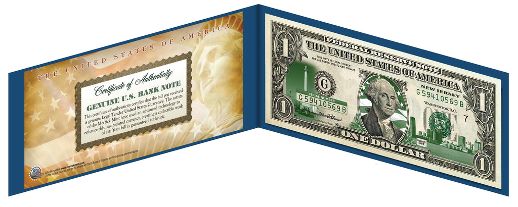 This NEW JERSEY State uncirculated One-Dollar Bill is Genuine Legal Tender of the United States, which has been enhanced with beautiful iconic images of the State. The green-and-white colorized images are accomplished through a revolutionary new authentic & genuine colorization process pioneered by The Merrick Mint, creating a collectible work of art. Included is a blue display portfolio plus a Certificate of Authenticity to guaranty that your bill is authentic and recognized by every monetary authority around the world, and assuring its Collector Edition status. Only genuine Legal Tender $1 United States Bills are used for this unique colorization process. Each $1 Bill is in FRESH, CRISP, UNCIRCULATED condition, and was directly removed from untouched wrapped Federal Reserve sealed packs. The first U.S. President, George Washington , is featured on the obverse, along with the special colorization overlay. The Great Seal of the United States is featured on the reverse.