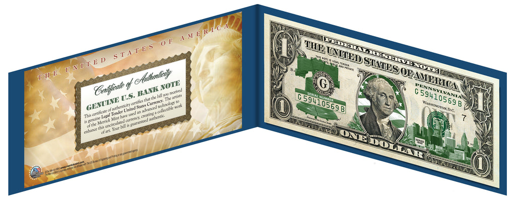 This PENNSYLVANIA State uncirculated One-Dollar Bill is Genuine Legal Tender of the United States, which has been enhanced with beautiful iconic images of the State. The green-and-white colorized images are accomplished through a revolutionary new authentic & genuine colorization process pioneered by The Merrick Mint, creating a collectible work of art. Included is a blue display portfolio plus a Certificate of Authenticity to guaranty that your bill is authentic and recognized by every monetary authority around the world, and assuring its Collector Edition status. Only genuine Legal Tender $1 United States Bills are used for this unique colorization process. Each $1 Bill is in FRESH, CRISP, UNCIRCULATED condition, and was directly removed from untouched wrapped Federal Reserve sealed packs. The first U.S. President, George Washington , is featured on the obverse, along with the special colorization overlay. The Great Seal of the United States is featured on the reverse.