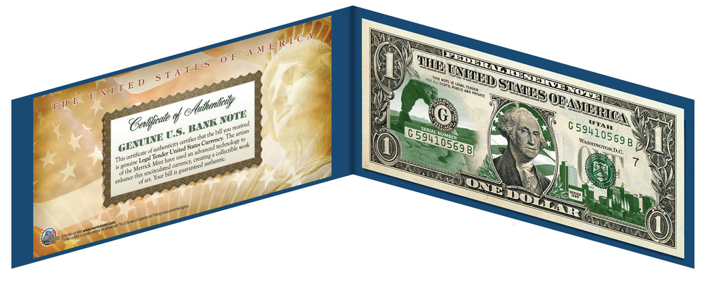This UTAH State uncirculated One-Dollar Bill is Genuine Legal Tender of the United States, which has been enhanced with beautiful iconic images of the State. The green-and-white colorized images are accomplished through a revolutionary new authentic & genuine colorization process pioneered by The Merrick Mint, creating a collectible work of art. Included is a blue display portfolio plus a Certificate of Authenticity to guaranty that your bill is authentic and recognized by every monetary authority around the world, and assuring its Collector Edition status. Only genuine Legal Tender $1 United States Bills are used for this unique colorization process. Each $1 Bill is in FRESH, CRISP, UNCIRCULATED condition, and was directly removed from untouched wrapped Federal Reserve sealed packs. The first U.S. President, George Washington , is featured on the obverse, along with the special colorization overlay. The Great Seal of the United States is featured on the reverse.