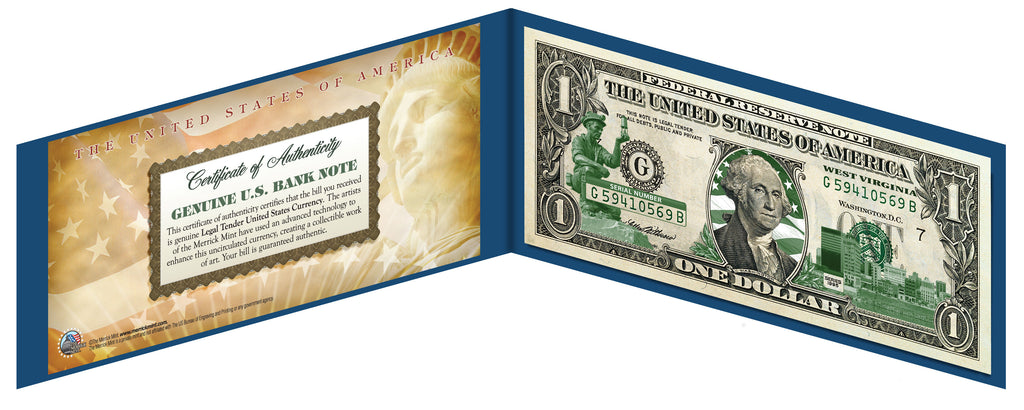 This WEST VIRGINIA State uncirculated One-Dollar Bill is Genuine Legal Tender of the United States, which has been enhanced with beautiful iconic images of the State. The green-and-white colorized images are accomplished through a revolutionary new authentic & genuine colorization process pioneered by The Merrick Mint, creating a collectible work of art. Included is a blue display portfolio plus a Certificate of Authenticity to guaranty that your bill is authentic and recognized by every monetary authority around the world, and assuring its Collector Edition status. Only genuine Legal Tender $1 United States Bills are used for this unique colorization process. Each $1 Bill is in FRESH, CRISP, UNCIRCULATED condition, and was directly removed from untouched wrapped Federal Reserve sealed packs. The first U.S. President, George Washington , is featured on the obverse, along with the special colorization overlay. The Great Seal of the United States is featured on the reverse.