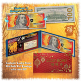 This 2016 YEAR OF THE MONKEY uncirculated $100 Bill is Genuine Authentic Legal Tender of the United States, which has been enhanced with a special colorization process by The Merrick Mint. This is the ultimate gift to bring good luck for the Lunar New Year. This bill is enhanced with Holographic Gold images of Monkeys to represent the Chinese Year of the Monkey. Each bill comes displayed in a blue folio with a Certificate of Authenticity to guarantee that your bills are authentic and recognized by every monetary authority around the world, therefore assuring its Collector Edition status. Each $100 Bill is in FRESH, CRISP, UNCIRCULATED condition, and was directly removed from untouched wrapped Federal Reserve sealed packs.