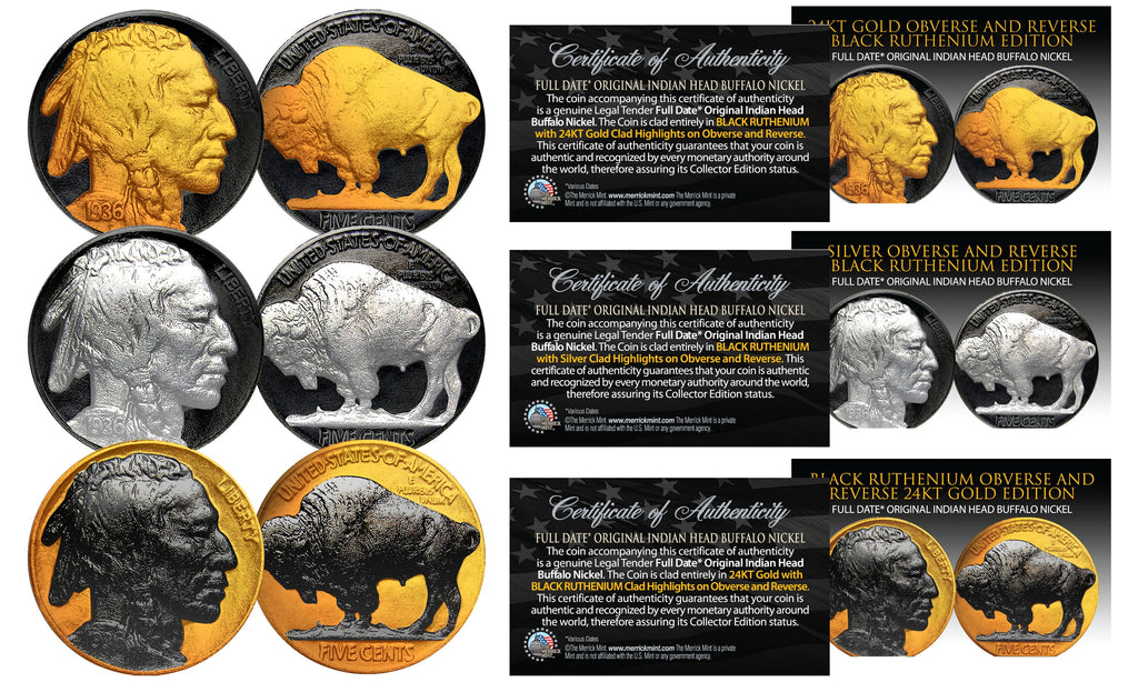 1930's Original Indian Head Buffalo Nickel *FULL DATES* Set of 3 Rare Metal Versions (Black Ruthenium, Silver, 24K Gold). Here is your chance to own a Set of 3 spectacular Original Indian Head Nickels from the 1930's (FULL DATES SHOWN). You will get all three Rare Metal Versions of this Original Indian Head Buffalo Nickel. You will receive all 3 versions...VERSION #1 Black Ruthenium with 24K Gold Highlights, VERSION #2 Black Ruthenium with .999 Fine Silver Highlights & VERSION #3 24K Gold with Black Ruthenium Highlights. Years are all Random Chosen from the 1930's.