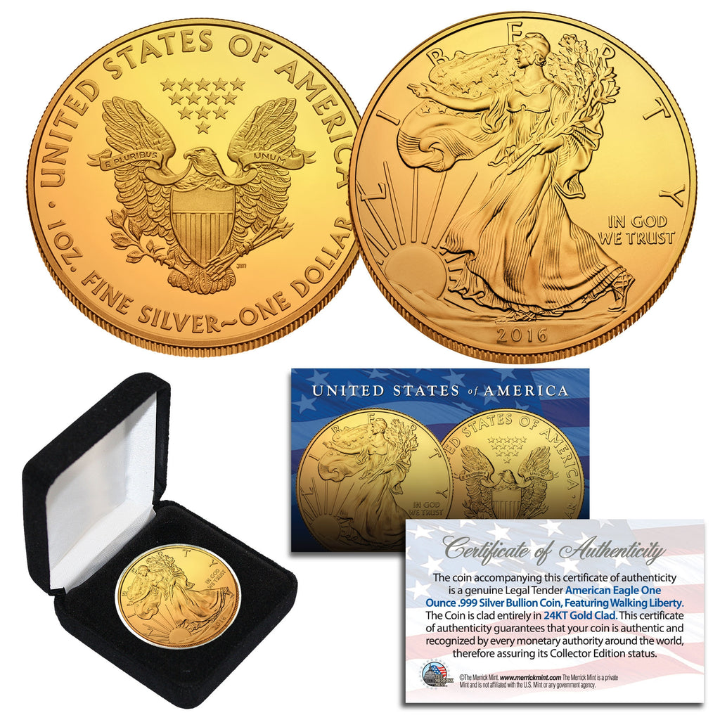 NEW! 2016 Edition. Here is your chance to own a genuine 24 Karat Gold Plated 2016 American .999 Fine Silver Eagle Dollar U.S. Coin. The American Silver Eagle Dollar coin is genuine legal tender struck by the U.S. Mint. It is minted in one full ounce of .999 PURE SILVER and measures a massive 40.6mm in diameter. Each coin comes in an acrylic coin holder and includes a Full Color 2-sided Certificate of Authenticity.