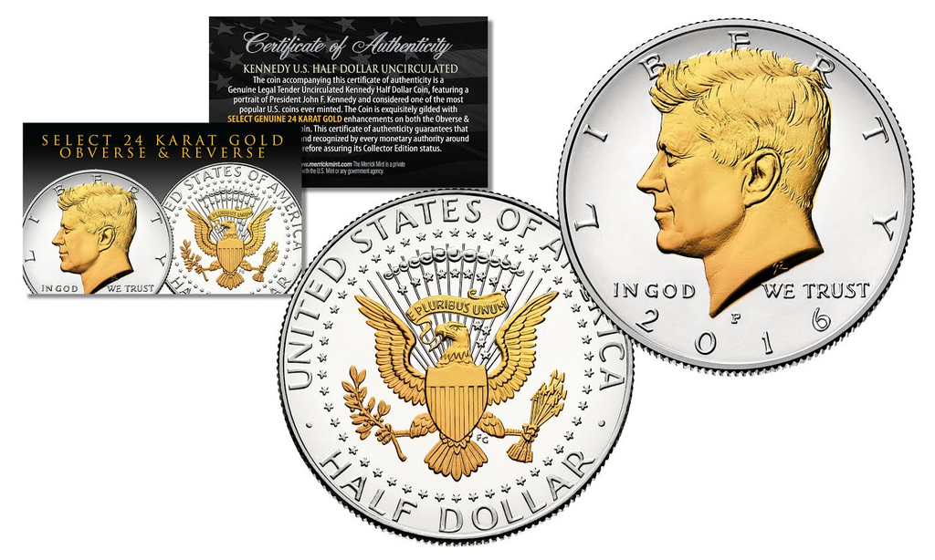 This coin is a Genuine Legal Tender Uncirculated Kennedy Half Dollar Coin, featuring a portrait of President John F. Kennedy and considered one of the most popular U.S. coins ever minted. The Coin is exquisitely gilded with SELECT GENUINE 24 KARAT GOLD enhancements on both the Obverse & Reverse sides of the coin. We guarantee that your coin is authentic and recognized by every monetary authority around the world, therefore assuring its Collector Edition status.
