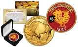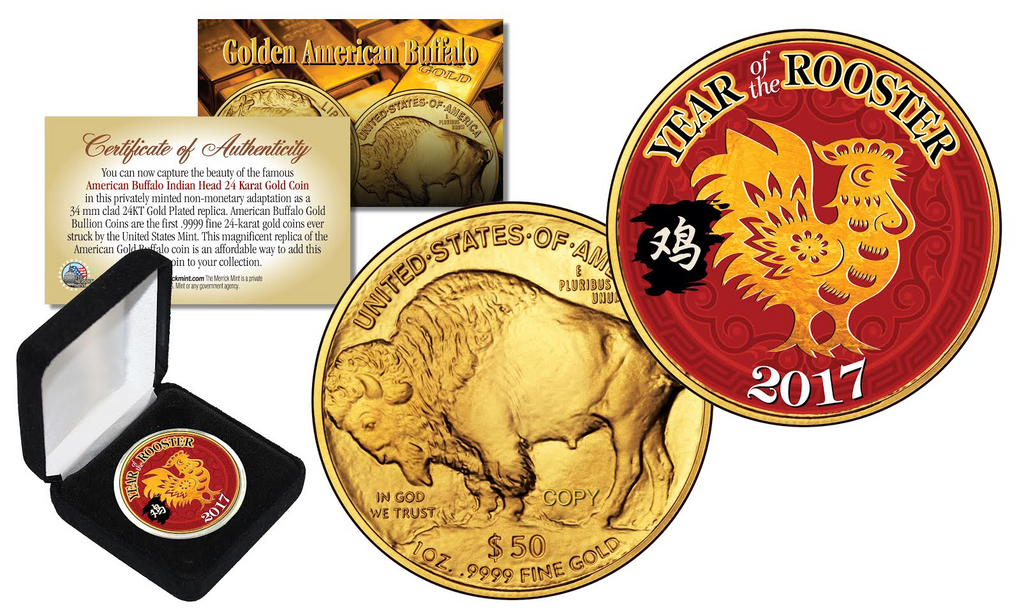 This CHINESE NEW YEAR 2017 – YEAR OF THE ROOSTER COIN is lucky money and a treasured collectible. Here is your chance to own or gift a beautifully colorized famous YEAR OF THE ROOSTER 24KT Gold Plated 2017 American Buffalo Indian Tribute Coin. This high-quality coin has been layered in Genuine 24 Karat Gold, and then enhanced with beautiful colorized images using a unique painstaking multicolor authentic process. Colorizing coins involves the unique application of special inks directly to the surface of a coin that achieves a level of detail, color saturation, and durability that is #1 in the coin industry. The result is an everlasting colorized coin collectible of ultra-high quality. Each coin comes in a premium coin capsule with a Certificate of Authenticity..
