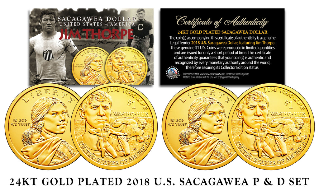 Since 2009, this $1 coin has displayed an annually-changing reverse design that recognizes the important contributions made by Indian tribes and individual Native Americans to the history and development of the United States. This year’s coin recognizes the accomplishments of Olympian and multi-talented athlete Jim Thorpe. The reverse design depicts Thorpe, with the foreground elements highlighting his football and Olympic achievements. Inscriptions are “JIM THORPE,” “WA-THO-HUK” (his native name), “UNITED STATES OF AMERICA,” and “$1.” The obverse (heads side) design retains the central figure “Sacagawea” carrying her infant son, Jean Baptiste. The inscriptions are “LIBERTY” and “IN GOD WE TRUST.”