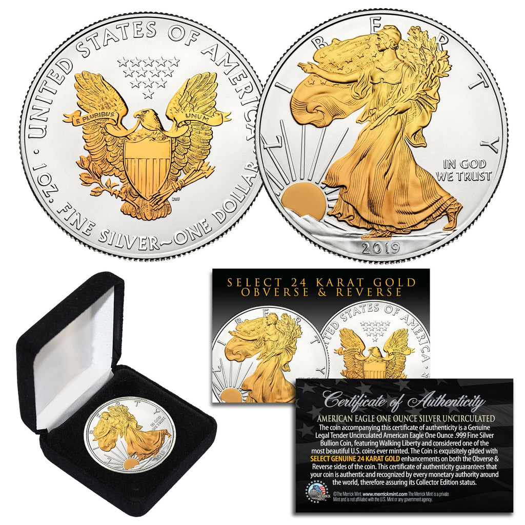This coin is a Genuine Legal Tender Uncirculated American Eagle One Ounce .999 Fine Silver Bullion Coin, featuring Walking Liberty and considered one of the most beautiful U.S. coins ever minted. The Coin is exquisitely gilded with SELECT GENUINE 24 KARAT GOLD enhancements on both the Obverse & Reverse sides of the coin. We guarantee that your coin is authentic and recognized by every monetary authority around the world, therefore assuring its Collector Edition status.