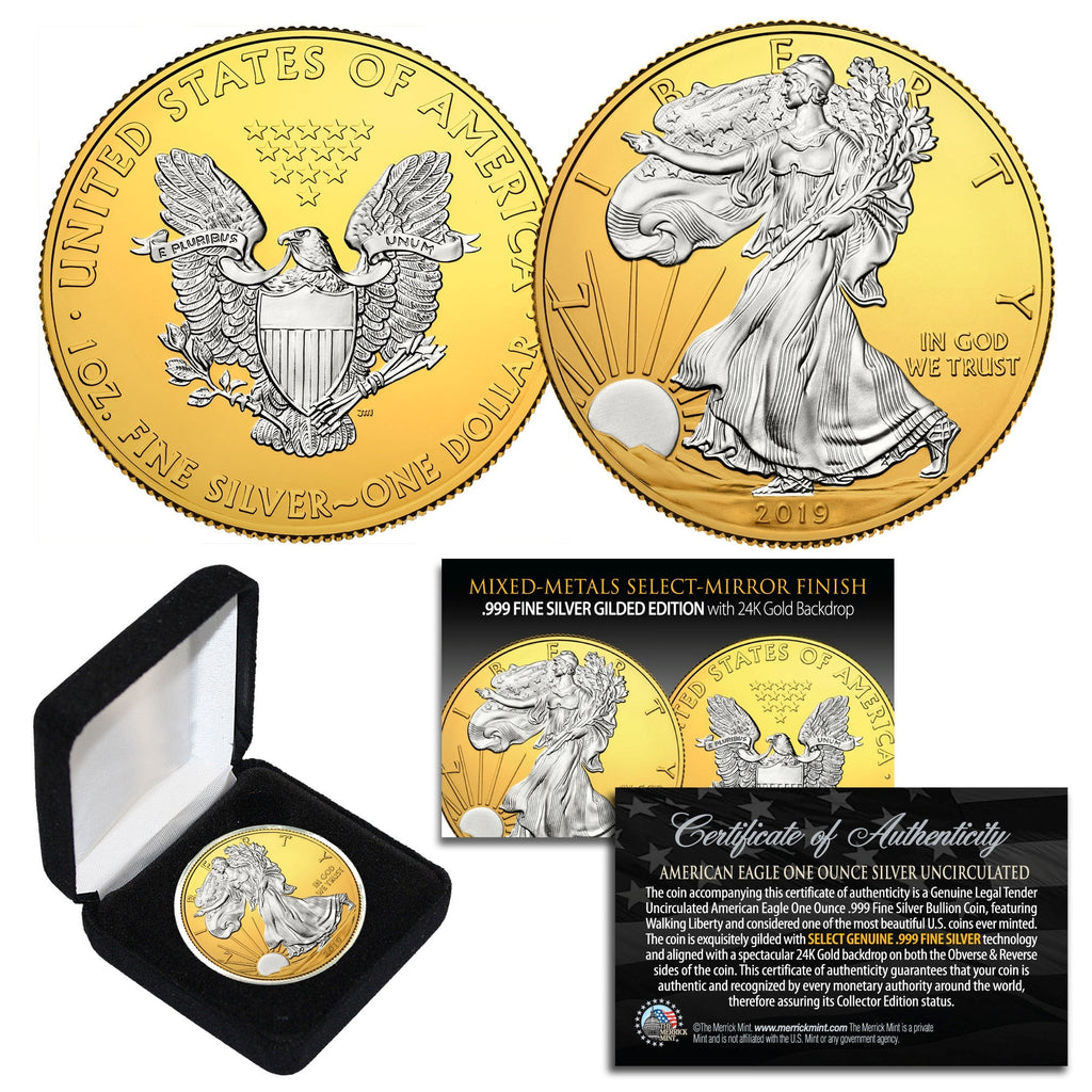 This coin is a Genuine Legal Tender Uncirculated American Eagle One Ounce .999 Fine Silver Bullion Coin, featuring Walking Liberty and considered one of the most beautiful U.S. coins ever minted. The coin is exquisitely gilded with SELECT GENUINE .999 FINE SILVER technology and aligned with a spectacular 24K Gold backdrop on both the Obverse & Reverse sides of the coin. What makes this coin spectacular is the unique MIRROR FINISH. We guarantee that your coin is authentic and recognized by every monetary authority around the world, therefore assuring its Collector Edition status.