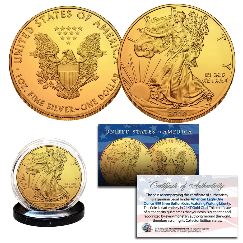 Here is your chance to own a genuine 24 Karat Gold Plated 2020 American .999 Fine Silver Eagle Dollar U.S. Coin. The American Silver Eagle Dollar coin is genuine legal tender struck by the U.S. Mint. It is minted in one full ounce of .999 PURE SILVER and measures a massive 40.6mm in diameter. Each coin comes in an acrylic coin holder and includes a Full Color 2-sided Certificate of Authenticity.