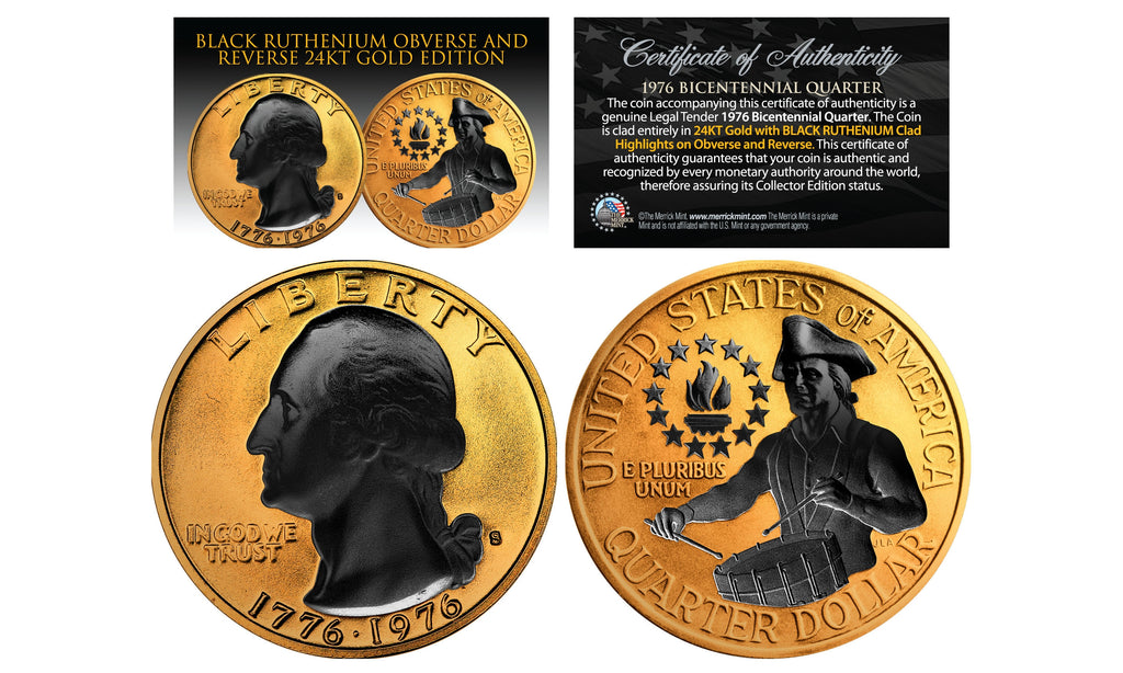 Here is your chance to own a genuine legal tender 1976 Bicentennial Quarter. The coin is coated fully in genuine 24KT Gold with Black Ruthenium Highlights. Black Ruthenium is a type of platinum metal that looks like a dark platinum, but is 100 times Rarer. Ruthenium is a chemical element with the symbol RU & Atomic # 44. It is a rare transition metal belonging to the platinum group of the periodic table.