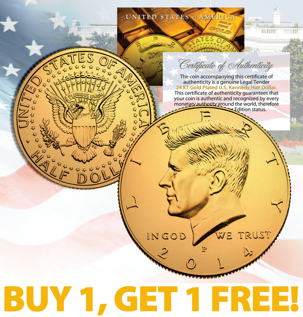 Buy one and get one FREE! Here is your chance to own the 24KT Gold Plated 2014 JFK Kennedy Half Dollar U.S. coin. Each coin is 24KT Gold Plated by the Merrick Mint to highlight the original design using a unique authentic process. The result is an everlasting 24KT Gold Plated coin collectible of ultra-high quality that is #1 in the industry. Each coin features the left portrait of John F. Kennedy design on the obverse and a modified presidential seal design on the reverse. Each coin is genuine legal tender of the United States and comes in an acrylic coin holder and includes a Full Color 2-sided Certificate of Authenticity. The 2014 Kennedy half dollar is a U.S. fifty cent coin with coin mint marks chosen at random.