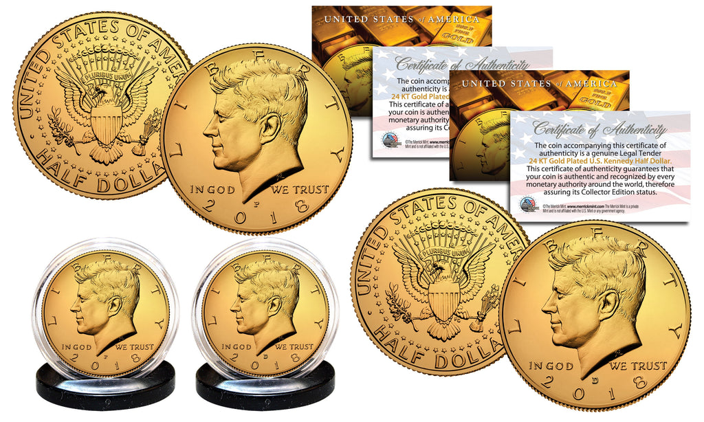 This 24KT Gold Plated 2018 JFK Kennedy Half Dollar U.S. 2-Coin Set includes both Philadelphia and Denver Mintage. Each coin is 24KT Gold Plated by the Merrick Mint to highlight the original design using a unique authentic process. The result is an everlasting 24KT Gold Plated coin collectible of ultra-high quality that is #1 in the industry. Each coin features the left portrait of John F. Kennedy design on the obverse and a modified presidential seal design on the reverse. Each coin is genuine legal tender of the United States and comes in an acrylic coin holder and includes a Full Color 2-sided Certificate of Authenticity.