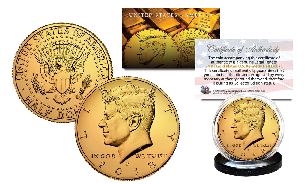 This is a 24KT Gold Plated 2018 JFK Kennedy Half Dollar U.S. Coin. This coin is 24KT Gold Plated by the Merrick Mint to highlight the original design using a unique authentic process. The result is an everlasting 24KT Gold Plated coin collectible of ultra-high quality that is #1 in the industry. Each coin features the left portrait of John F. Kennedy design on the obverse and a modified presidential seal design on the reverse. Each coin is genuine legal tender of the United States and comes in an acrylic coin holder and includes a Full Color 2-sided Certificate of Authenticity. The Kennedy half dollar is a U.S. fifty cent coin with mint marks chosen at random.
