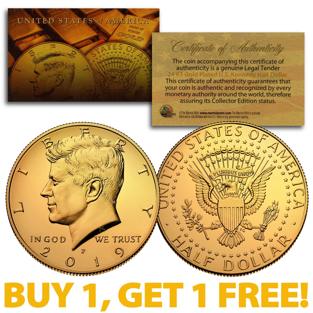 Buy one and get one FREE! Here is your chance to own the 24KT Gold Plated 2019 Philadelphia Mint JFK Kennedy Half Dollar U.S. coin. Each coin is 24KT Gold Plated by the Merrick Mint to highlight the original design using a unique authentic process. The result is an everlasting 24KT Gold Plated coin collectible of ultra-high quality that is #1 in the industry. Each coin features the left portrait of John F. Kennedy design on the obverse and a modified presidential seal design on the reverse. Each coin is genuine legal tender of the United States and comes in an acrylic coin holder and includes a Full Color 2-sided Certificate of Authenticity. The 2019 Kennedy half dollar is a U.S. fifty cent coin with P mint mark.