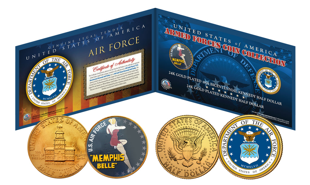 The Air Force 2-coin set includes a 24KT Gold plated JFK Kennedy Half Dollar and a 24KT Gold Plated 1976 Bicentennial Kennedy Half Dollar. The 2-coin set comes with a Certificate of Authenticity to guarantee that your coins are authentic and recognized by every monetary authority around the world, assuring its Collector Edition status. These Genuine Legal Tender United States coins have been colorized using a unique painstaking multicolor authentic process by the Merrick Mint. Colorizing coins involves the unique application of special inks directly to the surface of a coin that achieves a level of detail, color saturation, and durability that is #1 in the coin industry. The result is an everlasting colorized coin collectible of ultra-high quality.