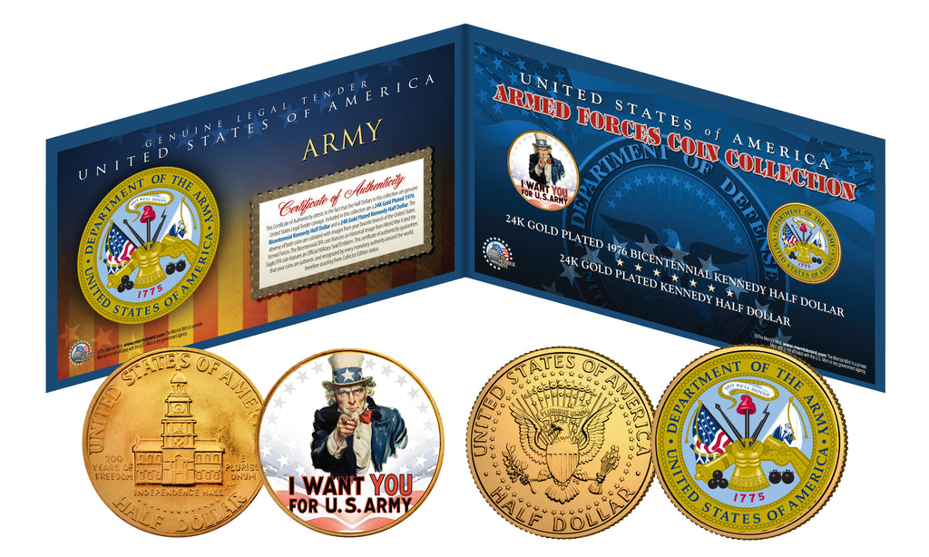 The Army 2-coin set includes a 24KT Gold plated JFK Kennedy Half Dollar and a 24KT Gold Plated 1976 Bicentennial Kennedy Half Dollar. The 2-coin set comes with a Certificate of Authenticity to guarantee that your coins are authentic and recognized by every monetary authority around the world, assuring its Collector Edition status. These Genuine Legal Tender United States coins have been colorized using a unique painstaking multicolor authentic process by the Merrick Mint. Colorizing coins involves the unique application of special inks directly to the surface of a coin that achieves a level of detail, color saturation, and durability that is #1 in the coin industry. The result is an everlasting colorized coin collectible of ultra-high quality.