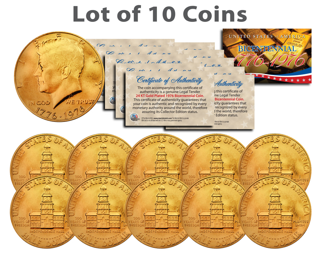 Here is your chance to own a lot of ten (10) 24KT Gold Plated Bicentennial 1976 JFK Kennedy Half Dollar U.S. coins. Each coin is 24KT Gold Plated by the Merrick Mint to highlight the original design using a unique authentic process. The result is an everlasting 24KT Gold Plated coin collectible of ultra-high quality that is #1 in the industry. Each Bicentennial coin features the left portrait of John F. Kennedy design on the obverse and an Independence Hall design on the reverse. Each coin is genuine legal tender of the United States and comes in a premium coin capsule. Each coin comes with a full color 2-sided Certificate of Authenticity to guaranty that your coin is authentic and recognized by every monetary authority around the world, assuring its Collector Edition status. The Kennedy half dollar is a U.S. fifty cent coin with coin mint marks chosen at random.