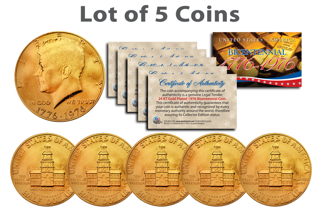 Here is your chance to own a lot of five (5) 24KT Gold Plated Bicentennial 1976 JFK Kennedy Half Dollar U.S. coins. Each coin is 24KT Gold Plated by the Merrick Mint to highlight the original design using a unique authentic process. The result is an everlasting 24KT Gold Plated coin collectible of ultra-high quality that is #1 in the industry. Each Bicentennial coin features the left portrait of John F. Kennedy design on the obverse and an Independence Hall design on the reverse. Each coin is genuine legal tender of the United States and comes in a premium coin capsule. Each coin comes with a full color 2-sided Certificate of Authenticity to guaranty that your coin is authentic and recognized by every monetary authority around the world, assuring its Collector Edition status. The Kennedy half dollar is a U.S. fifty cent coin with coin mint marks chosen at random.