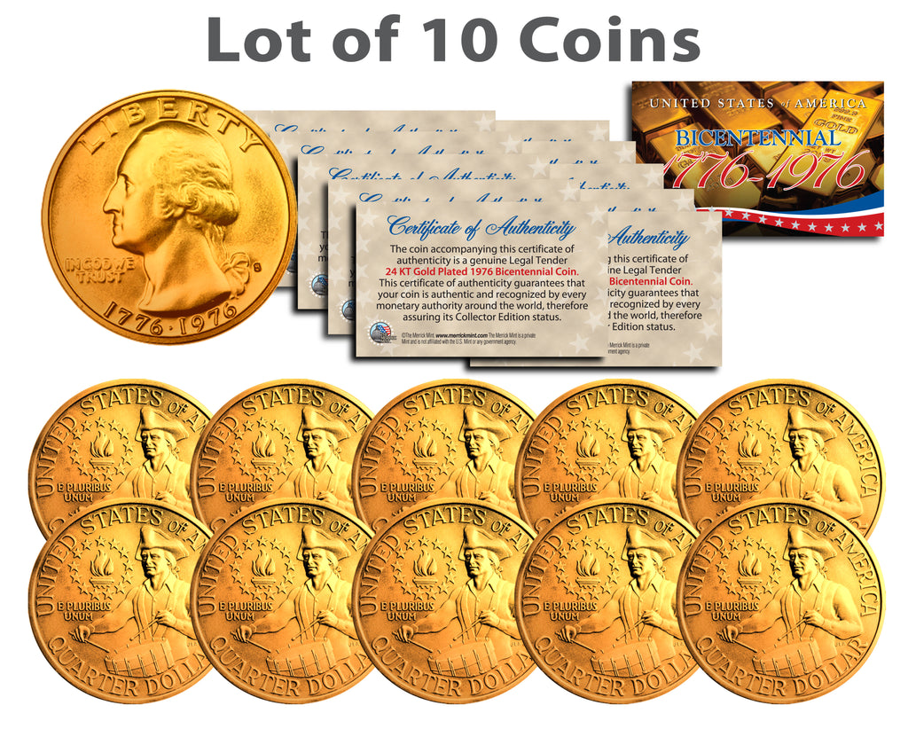 Here is your chance to own a lot of ten (10) 24KT Gold Plated Bicentennial 1976 Quarters U.S. coins. Each coin is 24KT Gold Plated by the Merrick Mint to highlight the original design using a unique authentic process. The result is an everlasting 24KT Gold Plated coin collectible of ultra-high quality that is #1 in the industry. Each Bicentennial coin features the left portrait of George Washington design on the obverse and Colonial drummer design on the reverse. Each coin is genuine legal tender of the United States and comes in a premium coin capsule. Each coin comes with a full color 2-sided Certificate of Authenticity to guaranty that your coin is authentic and recognized by every monetary authority around the world, assuring its Collector Edition status. The Quarter is a U.S. twenty-five cent coin with coin mint marks chosen at random.