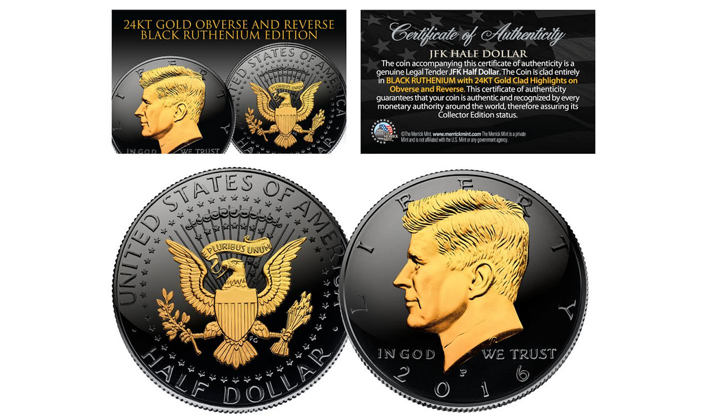 Here is your chance to own the BLACK RUTHENIUM EDITION 2016 JFK Kennedy Half Dollar U.S. Coin. To highlight the original coin design, the Merrick Mint has clad the coin in entirety in Black Ruthenium with the JFK Portrait on the coin obverse and reverse, clad in 24KT Gold. These uncirculated legal tender U.S. coins are not in general circulation and are not available in any bank. Each coin features the portrait in 24K Gold plating of John F. Kennedy design on the obverse and a modified presidential seal design on the reverse in 24K Gold Plating. Each coin comes in an acrylic coin holder and includes a Full Color 2-sided Certificate of Authenticity. The 2016 Kennedy half dollar is a U.S. fifty cent coin with P mint mark.