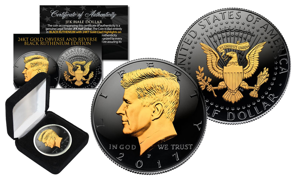 Here is your chance to own the BLACK RUTHENIUM EDITION 2017 JFK Kennedy Half Dollar U.S. Coin. To highlight the original coin design, the Merrick Mint has clad the coin in entirety in Black Ruthenium with the JFK Portrait on the coin obverse and reverse, clad in 24KT Gold. These uncirculated legal tender U.S. coins are not in general circulation and are not available in any bank. Each coin features the portrait in 24K Gold plating of John F. Kennedy design on the obverse and a modified presidential seal design on the reverse in 24K Gold Plating. Each coin comes in an acrylic coin holder and includes a Full Color 2-sided Certificate of Authenticity. The 2017 Kennedy half dollar is a U.S. fifty cent coin with P mint mark.