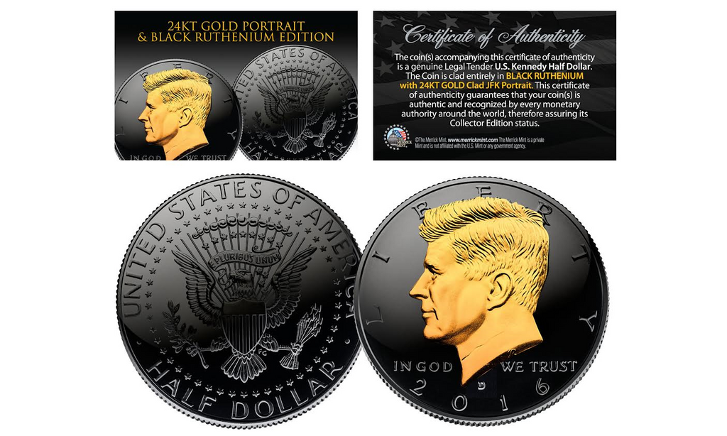 Here is your chance to own the BLACK RUTHENUM EDITION 2016 JFK Kennedy Half Dollar U.S. Coin. To highlight the original coin design, the Merrick Mint has clad the coin in entirety in Black Ruthenium with the JFK Portrait on the coin obverse clad in 24KT Gold. These uncirculated legal tender U.S. coins are not in general circulation and are not available in any bank. Each coin features the left portrait of John F. Kennedy design on the obverse and a modified presidential seal design on the reverse. Each coin comes in an acrylic coin holder and includes a Full Color 2-sided Certificate of Authenticity. The 2016 Kennedy half dollar is a U.S. fifty cent coin with D mint mark.