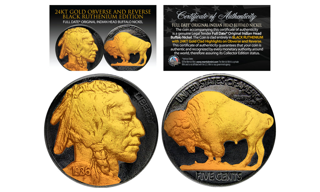 Here is your chance to own a original coin from the 1930's....a random full dated 1930's Black RUTHENIUM Original Indian Head Buffalo Nickel *FULL DATES* with 24KT Gold Clad Highlights on the Obverse & Reverse. The coin is coated with Black Ruthenium, which is a type of platinum metal that looks like a dark platinum, but is 100 times Rarer. Ruthenium is a chemical element with the symbol RU & Atomic # 44. It is a rare transition metal belonging to the platinum group of the periodic table.