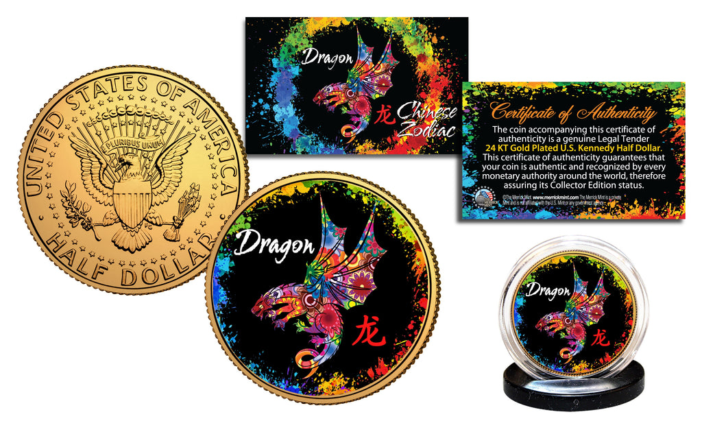 Chinese Zodiac PolyChrome Genuine Legal Tender JFK Kennedy Half Dollar 24K Gold Plated U.S. Coin - DRAGON
