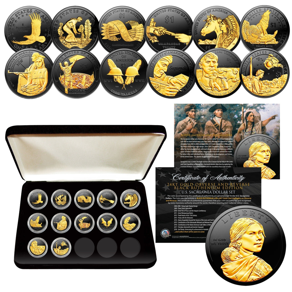 The greatest Sacagawea Golden Dollar Coin Set ever Assembled!!! The Sacagawea dollar (also known as the “golden dollar”) is a United States dollar coin that has been minted every year since 2000, although not released for general circulation from 2002 to 2008 and again from 2012 and onward. From 2000 to 2008, the reverse featured an eagle design. Since 2009, the reverse of the Sacagawea dollar has been changed yearly, with each design in the series depicting a different aspect of Native American cultures, recognizing the important contributions made by Indian tribes and individual Native Americans to the development and history of the United States. The obverse design features Sacagawea. Sacagawea was a Lemhi Shoshone woman who is known for her help in the Lewis and Clark Expedition achieving their chartered mission objectives by exploring the Louisiana Territory. Sacagawea traveled with the expedition thousands of miles from North Dakota to the Pacific Ocean. She helped establish cultural contacts with Native American populations in addition to her contributions to natural history. The coins accompanying this certificate of authenticity are genuine Legal Tender U.S. Sacagawea Dollars. The Coins are clad entirely in BLACK RUTHENIUM with 24KT Gold Clad Highlights on Obverse and Reverse. This certificate of authenticity guarantees that your coins are authentic and recognized by every monetary authority around the world, therefore assuring their Collector Edition status.