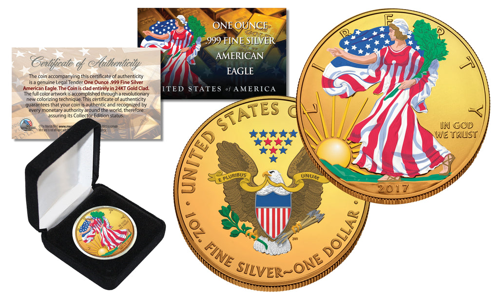 2017 Silver Eagles Clad in 24KT Gold and Color! You’ve heard of the famous American Silver Eagle, now we bring to you for the first time ever, the Silver Eagle completely gilded in 24KT Gold and Color. Some consider this the most beautiful coin ever! This incredible addition to your Silver Eagle collection has been lavished in 24KT Gold. Plus, parts of the designs on both the obverse and reverse have been beautifully colorized, making them stand out in decadent fashion from the gold fields! Each comes in Brilliant Uncirculated (BU) condition, housed in a black felt box. Collectors will be scrambling to add them to their collections, so secure yours now!