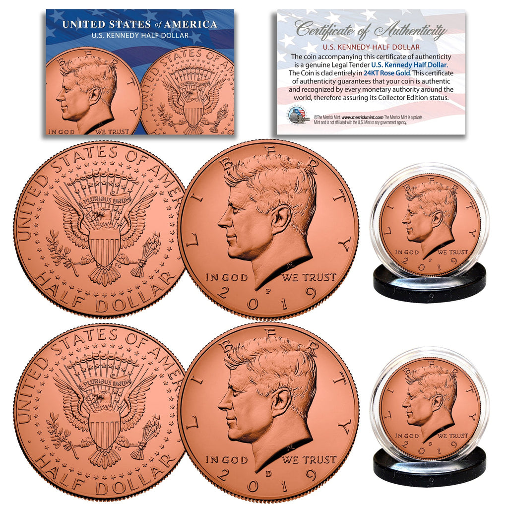 This Genuine Rose Gold Plated 2019 JFK Kennedy Half Dollar U.S. 2-Coin Set includes both Philadelphia and Denver Mintage. Each coin is Rose Gold Plated by the Merrick Mint to highlight the original design using a unique authentic process. The result is an everlasting Rose Gold Plated coin collectible of ultra-high quality that is #1 in the industry. Each coin features the left portrait of John F. Kennedy design on the obverse and a modified presidential seal design on the reverse. Rose gold is a delicate mixture of classic yellow gold, silver, and copper metals. The silver and the copper combine to create the pink hue we're familiar with when it comes to beautiful rose gold. Each coin is genuine legal tender of the United States and comes in an acrylic coin holder and includes a Full Color 2-sided Certificate of Authenticity.