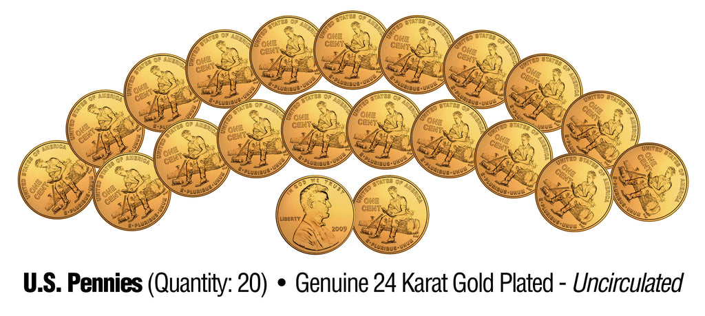 This second 2009 Lincoln penny was official released on May 14, 2009. The reverse design represents Lincoln's formative years in Indiana from 1816-1830 and portrays a young Lincoln sitting on a log with a book in hand while working as a rail splitter in Indiana. Here is your chance to own a lot of twenty (20) 24KT Gold Plated uncirculated 2009 Lincoln Bicentennial “Formative Years in Indiana” Pennies. Each genuine legal tender U.S. coin is 24KT Gold Plated by the Merrick Mint to highlight the original design using a unique authentic process. The result is an everlasting 24KT Gold Plated coin collectible of ultra-high quality that is #1 in the industry. Familiar President Lincoln bust design on the obverse.