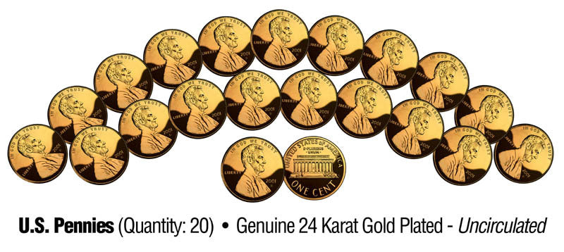 Here is your chance to own a lot of twenty (20) 24KT Gold Plated U.S. Pennies. Each genuine legal tender U.S. coin is 24KT Gold Plated by the Merrick Mint to highlight the original design using a unique authentic process. The result is an everlasting 24KT Gold Plated coin collectible of ultra-high quality that is #1 in the industry. President Lincoln bust design on the obverse and Lincoln Memorial design on the reverse. The Lincoln Penny is a U.S. cent coin with coin year and mint marks chosen at random