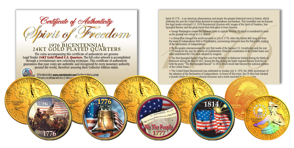 Here is your chance to own a set of five (5) SPIRIT OF FREEDOM 24KT Gold Plated Bicentennial 1976 Quarters U.S. coins. Each coin, which has been layered in Genuine 24 Karat Gold, is beautifully enhanced in permanent full-color by the Merrick Mint to highlight the original design using a unique colorizing process, which involves the application of special inks directly to the surface of a coin. The result is an everlasting colorized coin collectible of ultra-high quality that is #1 in the industry. The Spirit of 1776 is an American phenomenon and simply the greatest historical event in history, which celebrates the year the United States declared its independence and freedom. This incredible coin set features five legal tender colorized coins with images of the great events that took place to form America. Each Bicentennial coin features the Colonial drummer design on the reverse. Each coin is genuine legal tender of the United States and comes in a premium coin capsule. Each set comes with a full color 2-sided Certificate of Authenticity to guaranty that your coins are authentic and recognized by every monetary authority around the world, assuring its Collector Edition status. The Quarter is a U.S. twenty-five cent coin with coin mint marks chosen at random.
