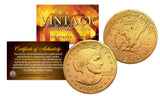 Here is your chance to own a 24KT Gold Plated Susan B. Anthony U.S. Dollar. Each genuine legal tender U.S. coin is 24KT Gold Plated by the Merrick Mint. The result is an everlasting 24KT Gold Plated coin collectible of ultra-high quality. Each coin comes in a premium coin capsule with a Certificate of Authenticity to guarantee that your coin is authentic and recognized by every monetary authority around the world, assuring its Collector Edition status. Profile of Susan B. Anthony design on the obverse and An eagle clutching a laurel branch in its talons, displayed over a landscape of the Moon on the reverse. The Susan B. Anthony Dollar is a U.S.one dollar coin with coin year and mint marks chosen at random