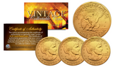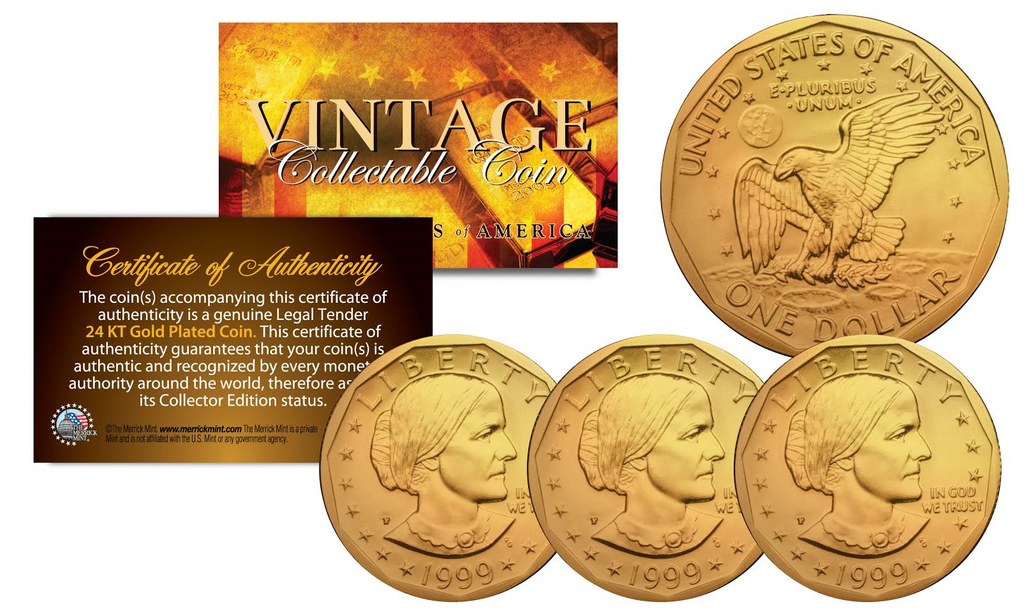 Here is your chance to own a lot of three (3) 24KT Gold Plated Susan B. Anthony U.S. Dollars. Each genuine legal tender U.S. coin is 24KT Gold Plated by the Merrick Mint. The result is an everlasting 24KT Gold Plated coin collectible of ultra-high quality. Each coin comes in a premium coin capsule with a Certificate of Authenticity to guarantee that your coin is authentic and recognized by every monetary authority around the world, assuring its Collector Edition status. Profile of Susan B. Anthony design on the obverse and an eagle clutching a laurel branch in its talons, displayed over a landscape of the Moon on the reverse. The Susan B. Anthony Dollar is a U.S. One Dollar coin with coin year and mint marks chosen at random.