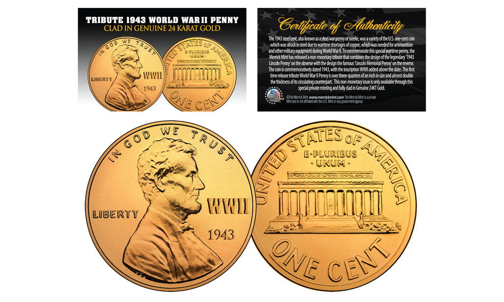 The 1943 steel cent, also known as a steel war penny or steelie, was a variety of the U.S. one-cent coin which was struck in steel due to wartime shortages of copper, which was needed for ammunition and other military equipment during World War II. To commemorate this special wartime penny, the Merrick Mint has released a non-monetary tribute that combines the design of the legendary ‘1943 Lincoln Penny’ on the obverse with the design the famous ‘Lincoln Memorial Penny’ on the reverse. The coin is commemoratively dated 1943, with the inscription WWII added above the date. This first time release tribute World War II Penny is over three-quarters of an inch in size and almost double the thickness of its circulating counterpart. This non-monetary issue is only available through this special private minting and fully clad in Genuine 24KT Gold.