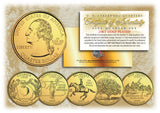 Here is your chance to own a complete set of five (5) 24KT Gold Plated 1999 Statehood Quarters U.S. Coins featuring five states: DE, PA, NJ, GA, CT. Each coin is 24KT Gold Plated by the Merrick Mint to highlight the original design using a unique authentic process. The result is an everlasting 24KT Gold Plated coin collectible of ultra-high quality that is #1 in the industry. Each coin features a unique state design on the reverse and a common obverse with portrait of George Washington. Each coin is genuine legal tender of the United States and comes in an acrylic coin holder and includes a Full Color 2-sided Certificate of Authenticity. The State Quarters Program was the most popular commemorative coin program in United States history.