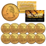 2001 Kentucky State Quarters U.S. Mint BU Coins 24K GOLD PLATED (Quantity 10). All 10 coins have been entirely plated with 24 Karat Gold by the Merrick Mint using the highest quality production process. The result is an everlasting 24KT Gold Plated coin collectible of ultra-high quality that is #1 in the industry. Each coin is genuine Legal Tender of the United States. You get Full Color 2-sided Certificate of Authenticity to guarantee that your coins are authentic and recognized by every monetary authority around the world, assuring its Collector Edition status. Mint Marks are all random. For the Low Price of $19.95, you get all 10 State Quarters Gilded in Genuine 24 Karat Gold...a remarkable value!