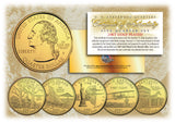 Here is your chance to own a complete set of five (5) 24KT Gold Plated 2001 Statehood Quarters U.S. Coins featuring five states: NY, NC, RI, VT, KY. Each coin is 24KT Gold Plated by the Merrick Mint to highlight the original design using a unique authentic process. The result is an everlasting 24KT Gold Plated coin collectible of ultra-high quality that is #1 in the industry. Each coin features a unique state design on the reverse and a common obverse with portrait of George Washington. Each coin is genuine legal tender of the United States and comes in an acrylic coin holder and includes a Full Color 2-sided Certificate of Authenticity. The State Quarters Program was the most popular commemorative coin program in United States history.