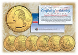 Here is your chance to own a complete set of six (6) 24KT Gold Plated 2009 DC and US Territories Quarters U.S. Coins featuring: DC, PR, GU, AS, VI, MP. Each coin is 24KT Gold Plated by the Merrick Mint to highlight the original design using a unique authentic process. The result is an everlasting 24KT Gold Plated coin collectible of ultra-high quality that is #1 in the industry. Each coin features a unique state design on the reverse and a common obverse with portrait of George Washington. Each coin is genuine legal tender of the United States and comes in an acrylic coin holder and includes a Full Color 2-sided Certificate of Authenticity. The State Quarters Program was the most popular commemorative coin program in United States history.