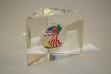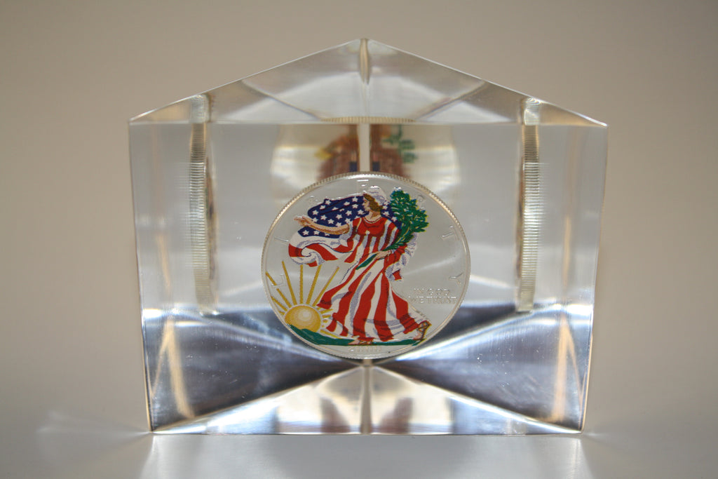 This collectible American Silver Eagle paperweight is near impossible to find. The beautiful colorized 2001 American Silver Eagle coin is permanently set in an acrylic Lucite paperweight, making it a magnificent display piece for your home or office. The coin is colorized on both sides. The colorized 2001 U.S. Silver Eagle Dollar is genuine legal tender struck by the U.S. Mint. It is minted in one full ounce of .999 PURE SILVER and measures 40.6mm in diameter. This brilliant uncirculated silver dollar has been enhanced by a unique colorization process. Coin inside this clear acrylic Lucite block gives it a 3D look, this is truly a piece you will cherish and share with all. The paperweight is 2-5/8” in height.