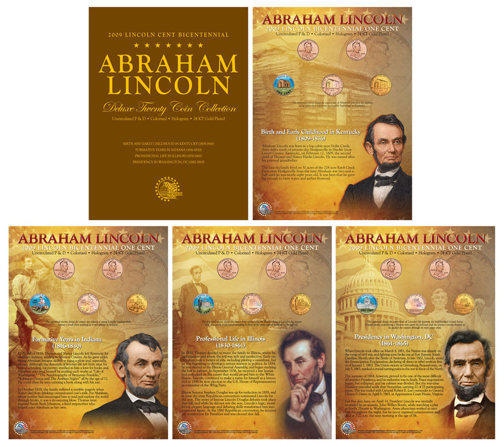 The 2009 Lincoln Bicentennial One Cent Program brings the life of America's 16th president to this popular circulating coin. Four different designs make up this series, all produced in 2009, in the order they happened (Birth and childhood in Kentucky, Youth in Indiana, Professional life in Illinois, and Presidency in Washington, DC). The year 2009 is not only the 200th anniversary of Abraham Lincoln's birth, but the 100th anniversary of the Lincoln cent as well, first appearing in 1909. The full 20-coin set that you will receive will feature special versions of these coins for collectors that feature enhancements by the Merrick Mint in spectacular Colorization, Hologram, and 24K Gold Plated. To complete your set you will also receive a "P" Mint and "D" Mint Lincoln One-Cent for each of the 4 Lincoln Penny versions made. Your complete set remarkably features all four different designs of the 2009 Lincoln Bicentennial Penny. You will well get all 4 panels displayed in a beautiful portfolio album which nicely folds up into a book. REGULAR PRICE of this Deluxe Twenty Coin Collection is $99.95. GREAT SAVINGS BY BUYING HERE NOW!!!
