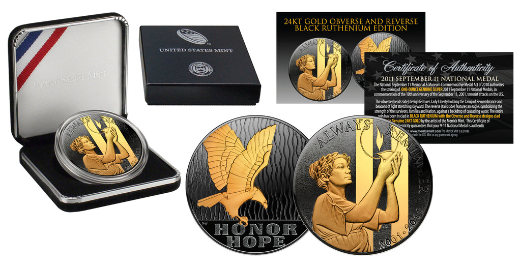 The 2011 September 11 National Medals were produced by the United States Mint in commemoration of the 10th anniversary of the September 11, 2001 terrorist attacks. The medals are struck to collector proof quality and contain one ounce of .999 fine silver. To highlight the original coin design, the Merrick Mint has clad the coin entirely in Black Ruthenium with Lady Liberty/beacons of light on the coin obverse and Eagle on the coin reverse clad in 24KT Gold. The medal has a smooth edge and a diameter of 1.598 inches. The obverse design features Lady Liberty holding the Lamp of Remembrance with beacons of light stretching skyward behind her and inscription ALWAYS REMEMBER and 2001-2011. The reverse design features an eagle against the backdrop of cascading water with inscription HONOR HOPE. Each medal comes in a coin capsule with a Certificate of Authenticity packaged in a U.S. Mint coin display metal box within a gift box.