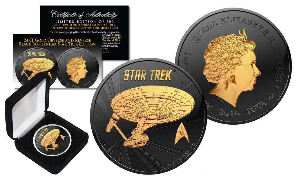 2016 1 oz BU Tuvalu Star Trek U.S.S. Enterprise NCC-1701 Silver Coin BLACK RUTHENIUM with 24KT Gold Clad Highlights 2-Sided. Here is your chance to own a genuine legal tender 2016 TUVALU STAR TREK BLACK RUTHENIUM EDITION Genuine 1 oz Silver Coin. The coin is coated with Black Ruthenium, which is a type of platinum metal that looks like a dark platinum, but is 100 times Rarer. Ruthenium is a chemical element with the symbol RU & Atomic # 44. It is a rare transition metal belonging to the platinum group of the periodic table. Star Trek celebrates the 50th Anniversary of the original science fiction television series in 2016. To commemorate the milestone, the Perth Mint has issued a stunning coin minted for the island nation of Tuvalu, with a limited mintage of 50,000. Each 2106 Silver Star Trek Enterprise coin is struck from 1 full Troy oz. of .999 fine silver, and measures 40.6mm in diameter. With a Limited Mintage, these 1 troy oz .9999 fine silver coins offer collectors and investors alike a unique opportunity to stack numismatic collectible silver coins. With a limited mintage and Star Trek's global popularity, we don't expect this opportunity to last long!